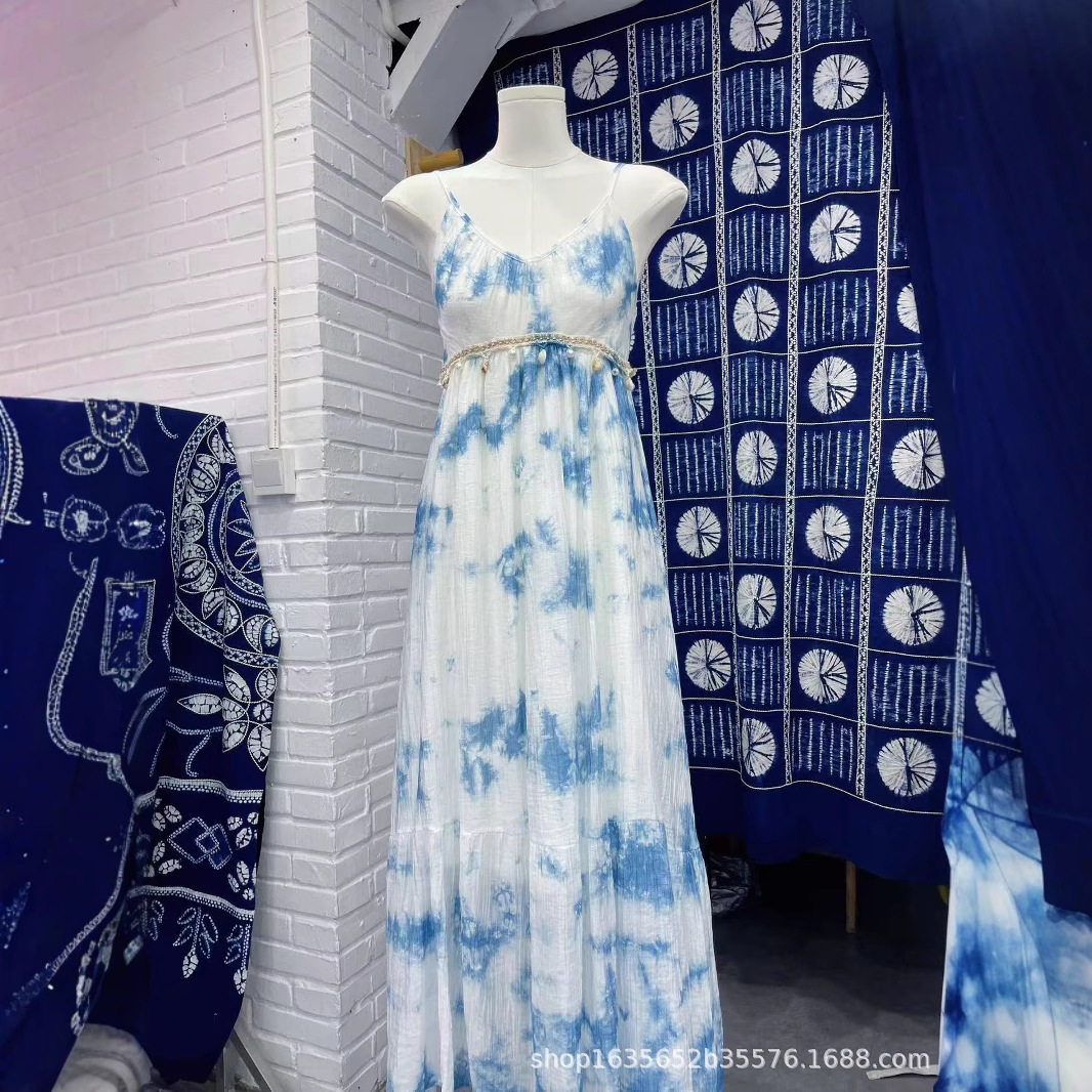 2025夏季新款纯手工扎染植物蓝白染吊带裙新款民族风沙滩裙显瘦