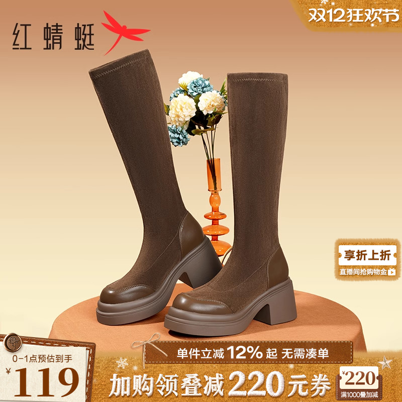 红蜻蜓长筒靴女冬季女靴高筒靴厚底棕色靴子不过膝弹力瘦瘦靴长靴