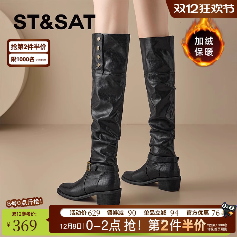 星期六过膝长筒靴女2025新款冬季粗跟显瘦堆堆靴子英伦黑色骑士靴