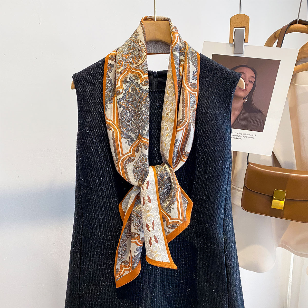 复古印花棉麻丝绒围巾女春秋薄款长条护颈围脖配衬衫西装领巾装饰