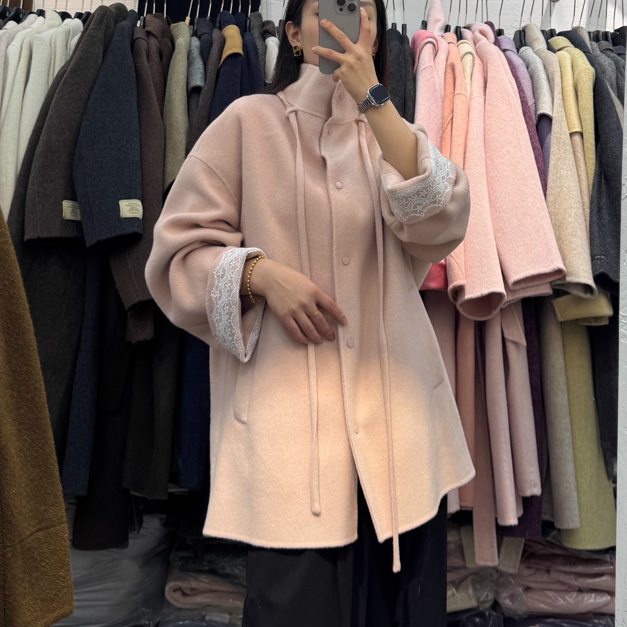 韩国东大门袖口蕾丝立领短款双面羊绒大衣女韩版宽松显瘦呢子外套