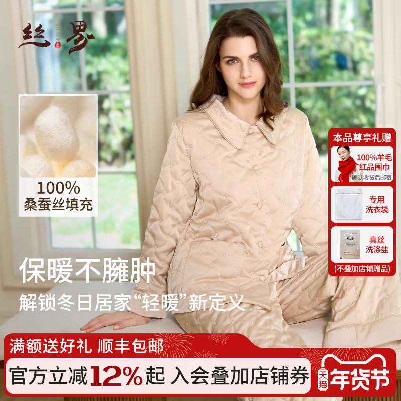 丝界新款棉袄填充物100%桑蚕丝保暖长袖家居服三层加厚睡衣女外穿