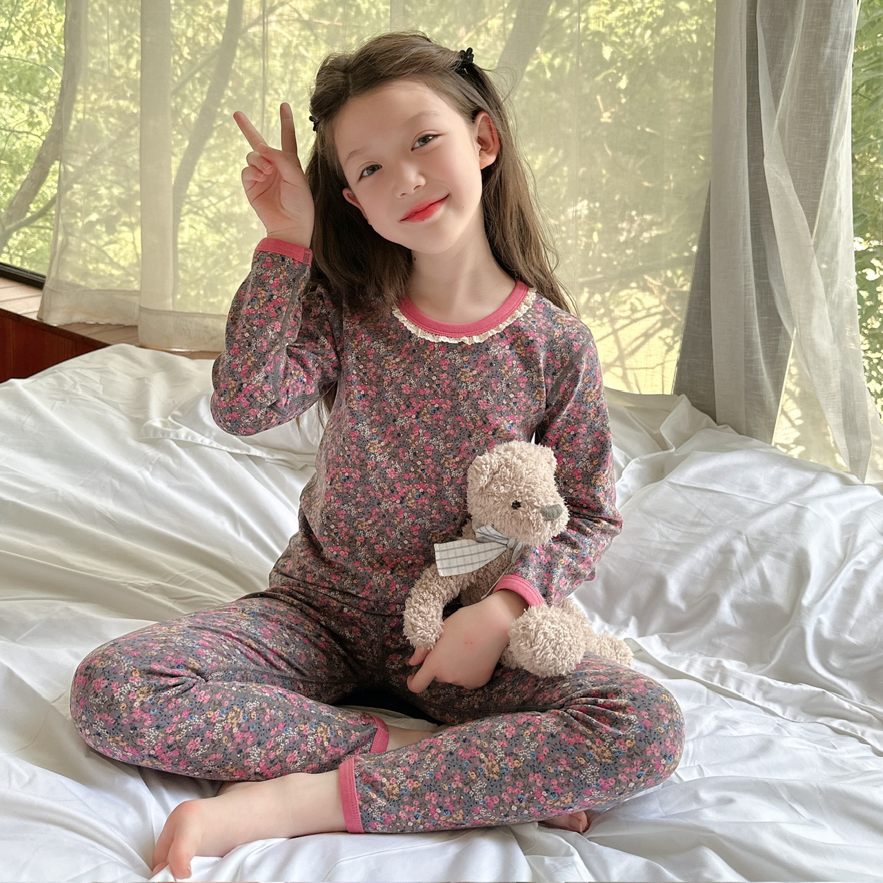 INS爆款韩国网红女童小碎花保暖内衣套装男宝无骨纯棉磨毛家居服