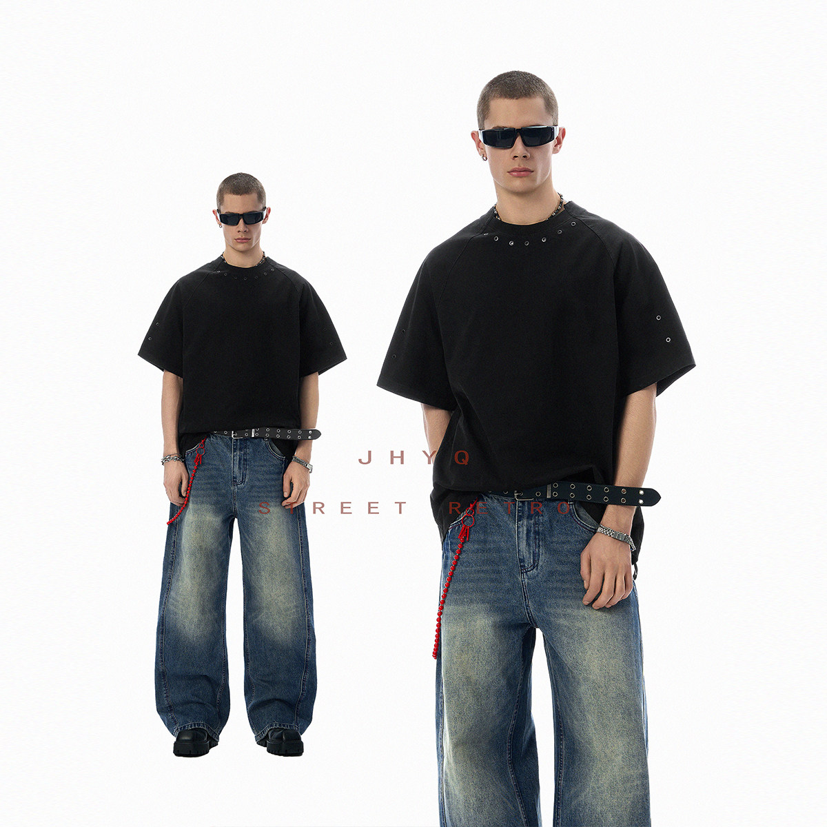 JHYQ净版无LOGO美式异型领弧形气眼设计纯棉短袖T恤男休闲插肩衣