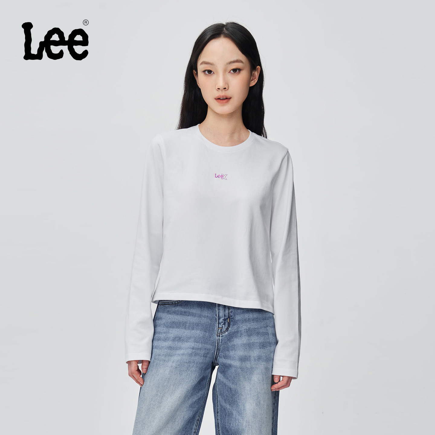 Lee经典圆领箔印字母Logo印花设计白色女长袖T恤休闲LWT0108753RX