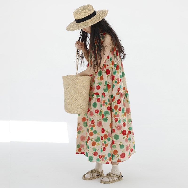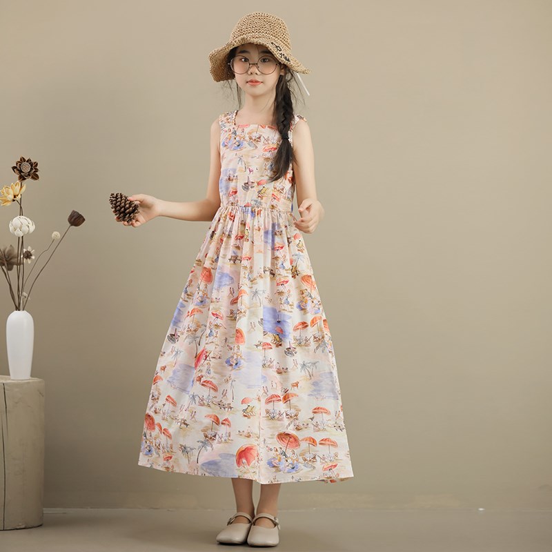 女童纯棉连衣裙夏l装中大童长裙碎花油泼墨沙滩裙度假公主裙背心