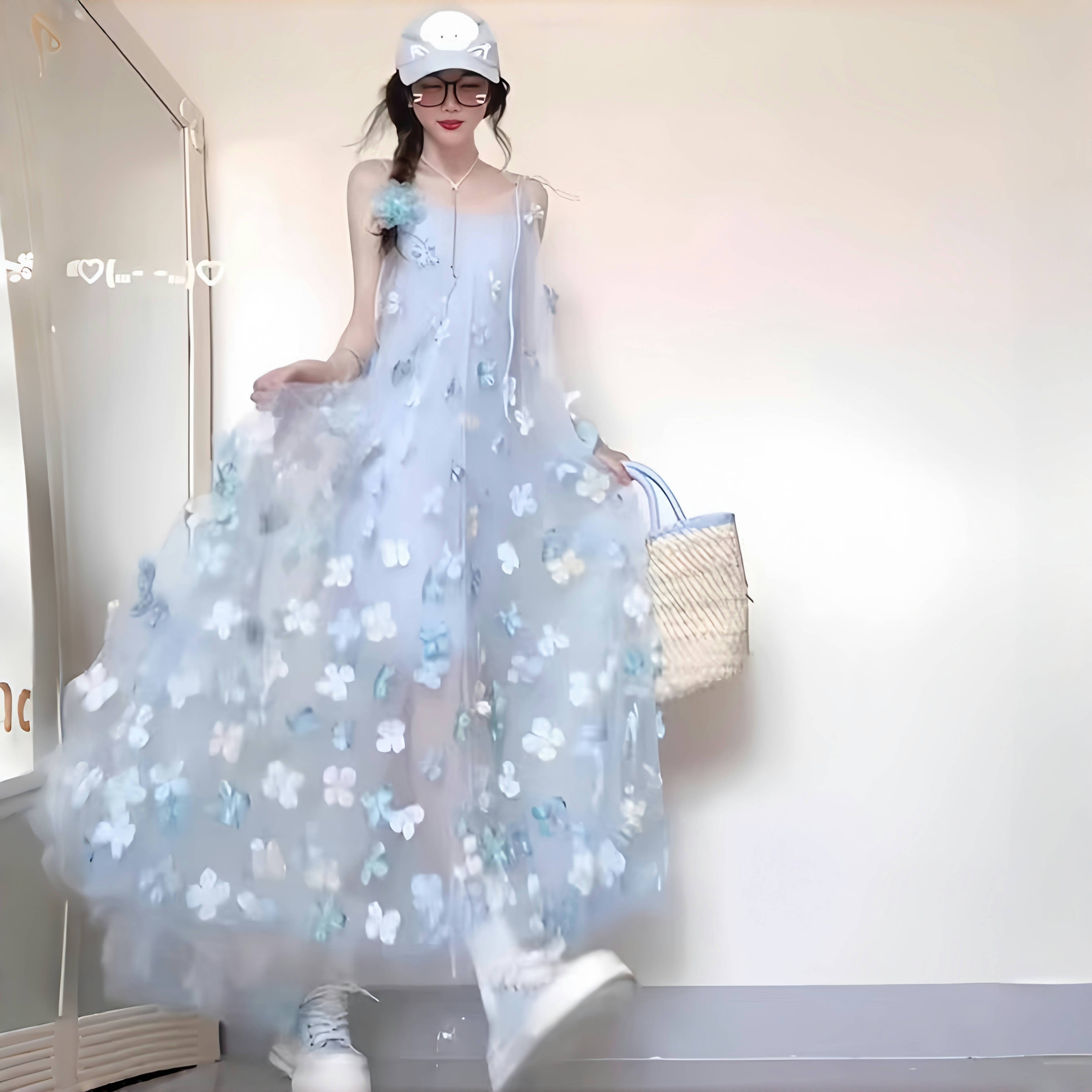 女童蓝色花朵网纱吊带连衣裙女夏多巴胺绝美旅游海边度假沙滩长裙