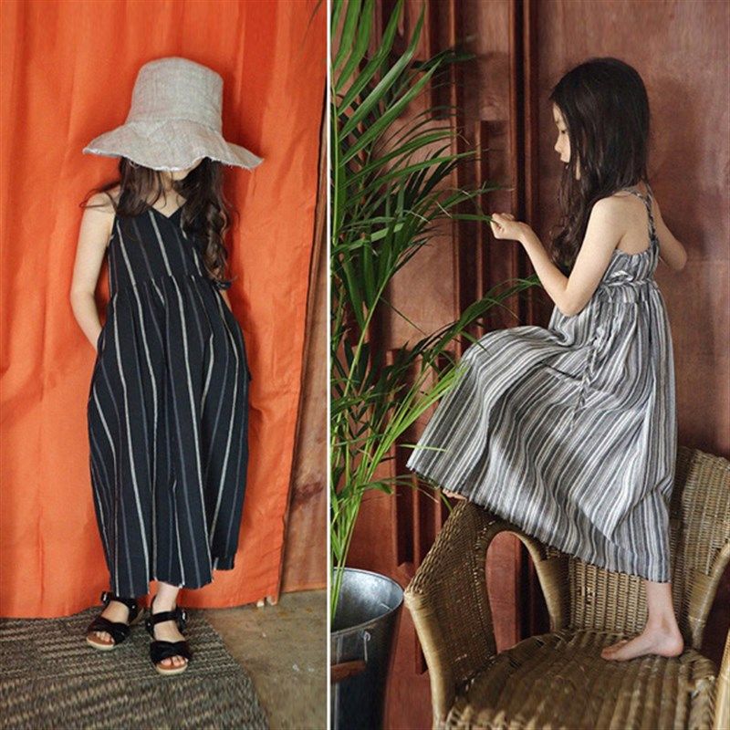 儿童海边度假连衣裙母女亲子装夏季棉麻条纹吊带裙子女童沙滩长裙