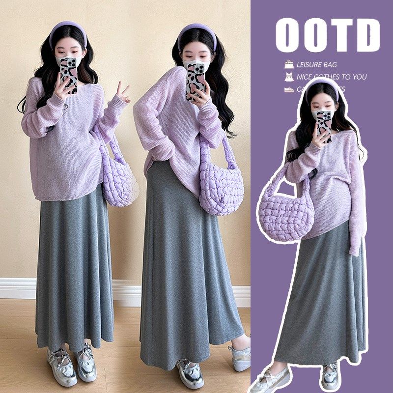 孕妇装春装长袖针织衫毛衣宽松托腹半身裙春季孕妇套装时尚两件套