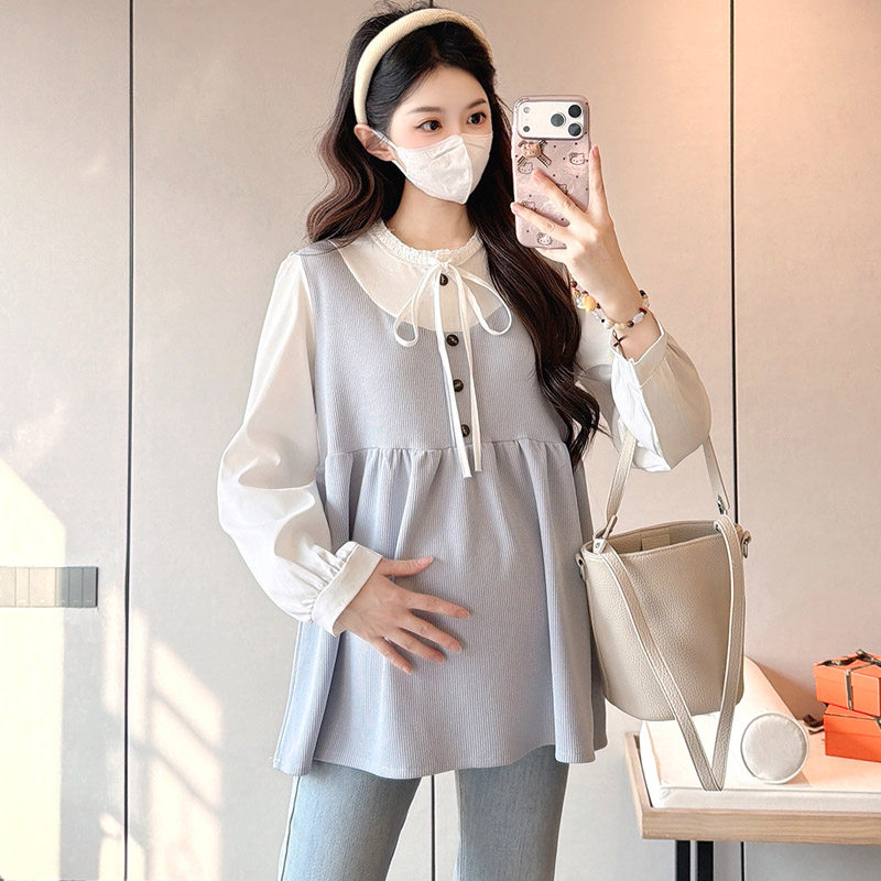 孕妇装春装设计感拼接长袖上衣宽松大码休闲娃娃衫春季百搭卫衣春