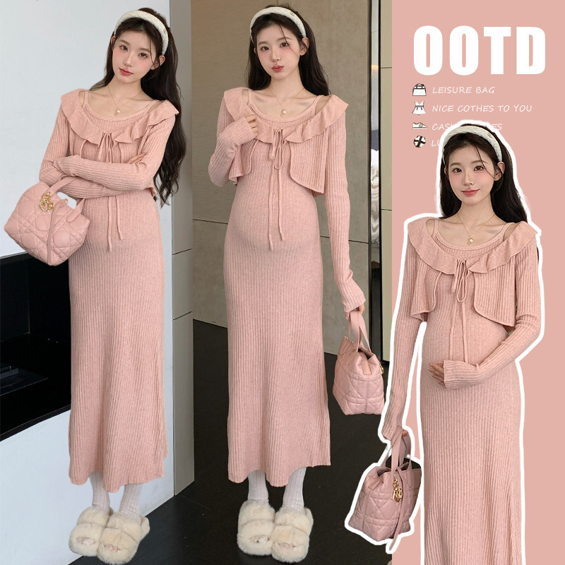 孕妇装春装长袖开衫春季吊带裙设计感两件套针织连衣裙套装裙子春