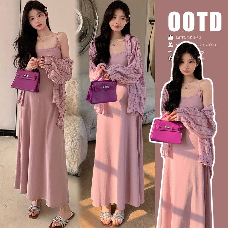 孕妇装春装长袖格子衬衫夏装吊带裙时尚休闲两件套连衣裙孕妇套装