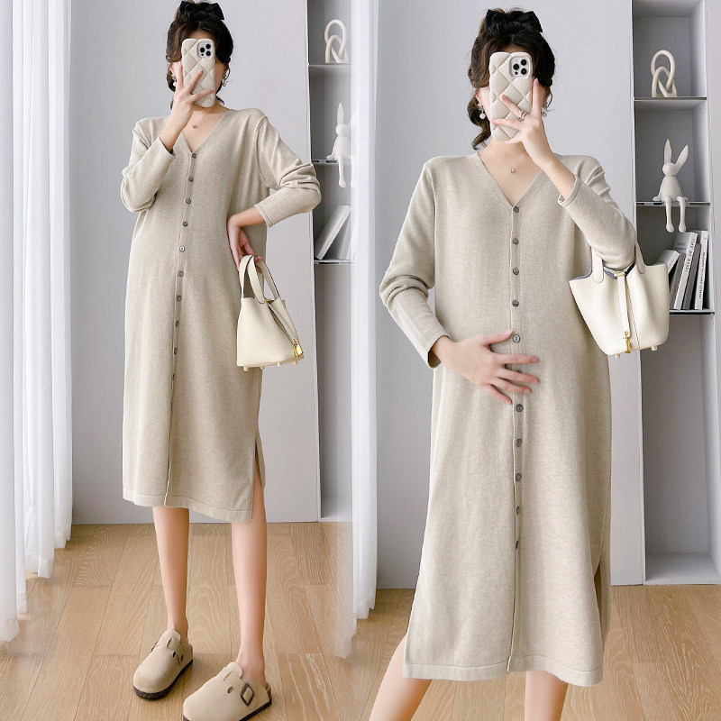 孕妇装春装长袖V领针织连衣裙2024新款孕妇裙春季简约怀孕打底裙