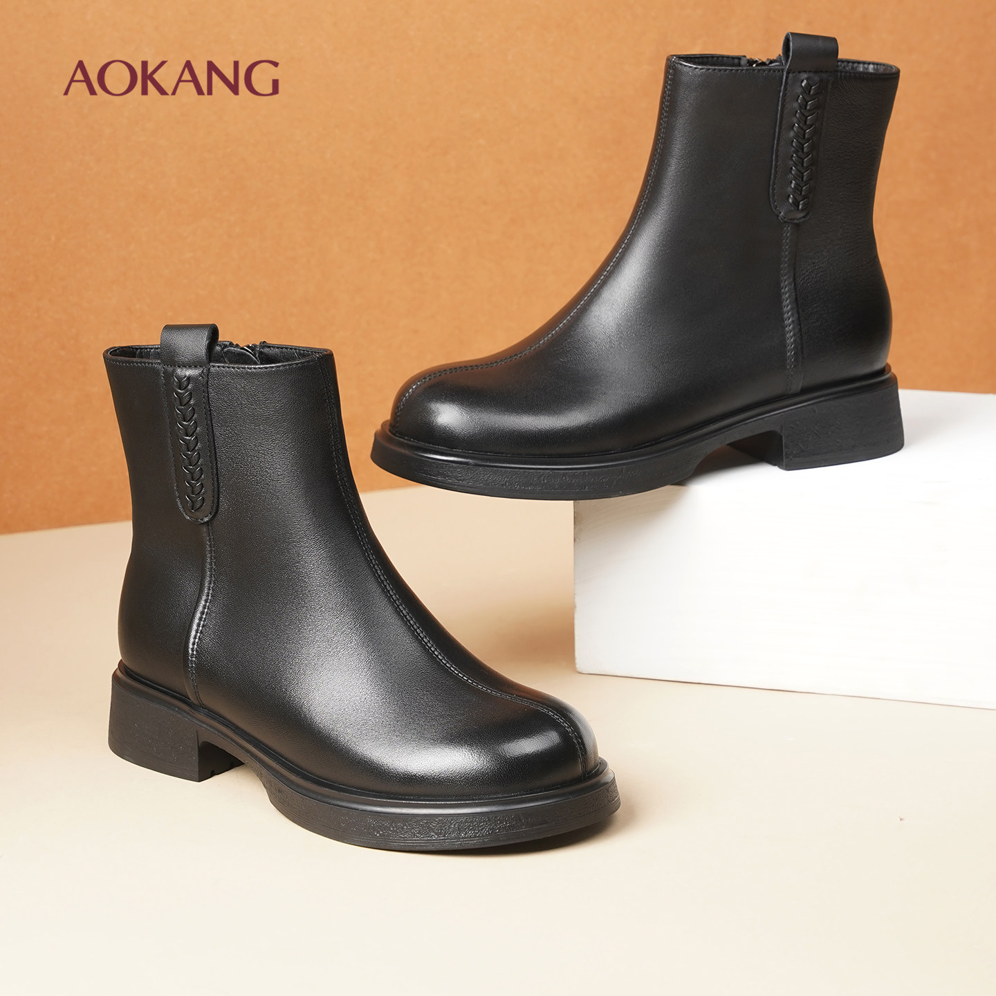 奥康 女鞋冬季新款切尔西靴真皮加绒保暖女靴羊皮粗跟短靴马丁靴L