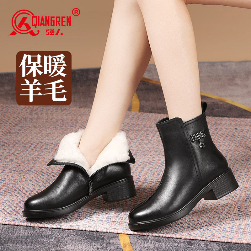 强人3515女靴冬季保暖羊毛靴真皮加绒时装靴皮棉鞋粗跟牛皮短靴女