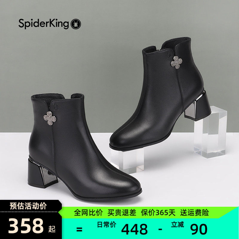 蜘蛛王加绒短靴秋冬季高跟鞋女鞋真皮时尚粗跟保暖牛皮妈妈女靴子