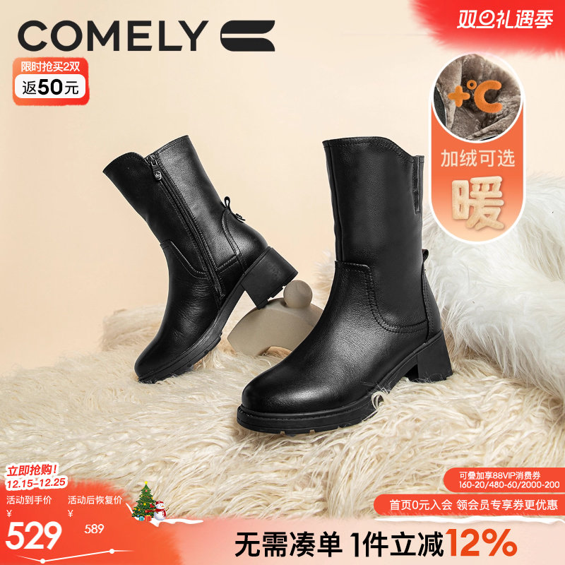 康莉商场新款加绒短靴女靴冬季新款真皮羊毛里粗跟中筒靴保暖靴子