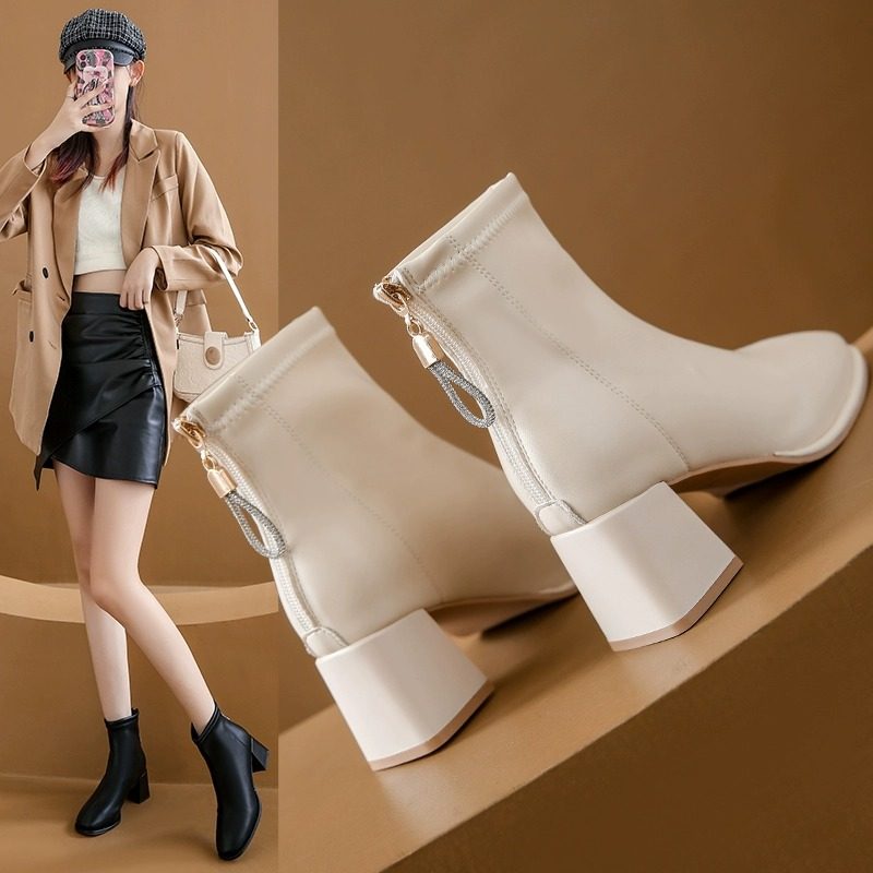 misili马丁靴粗跟短靴2024秋冬季新款高跟鞋防水台厚底真皮女靴子