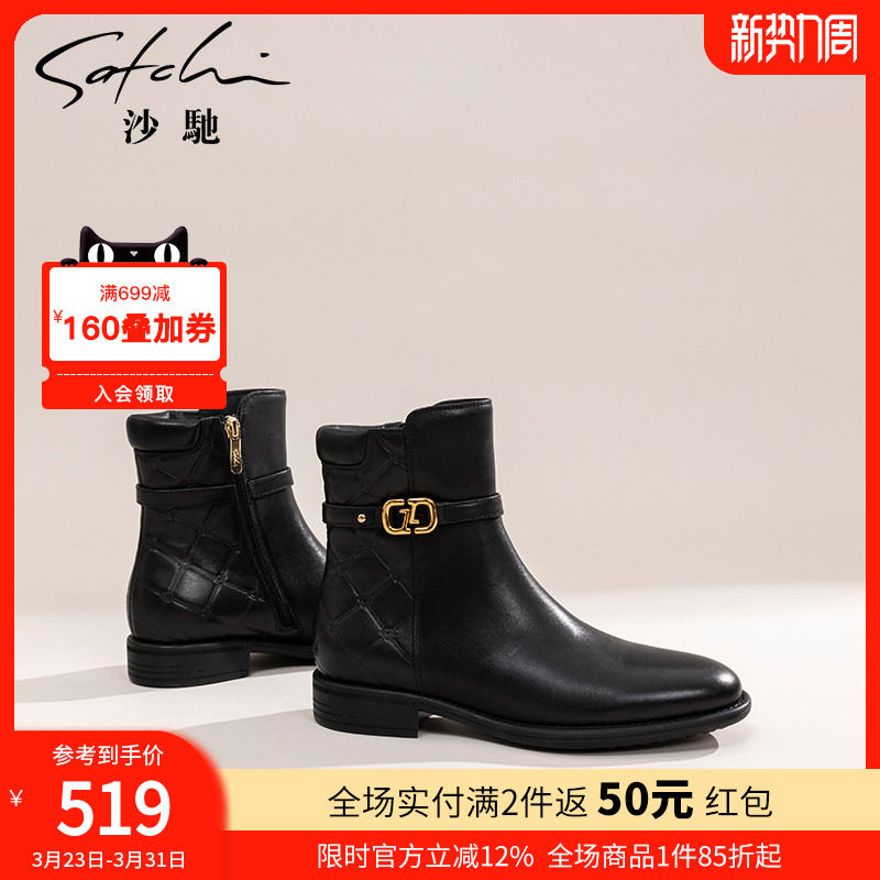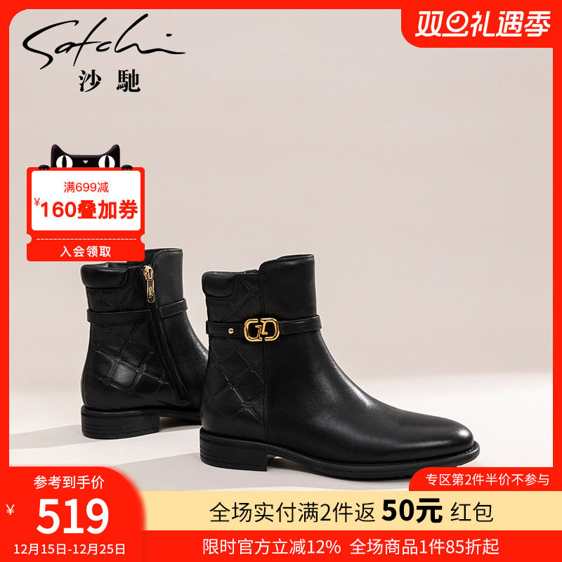 沙驰女靴时尚粗跟通勤短靴2025冬季新款加绒保暖时装靴拉链真皮靴