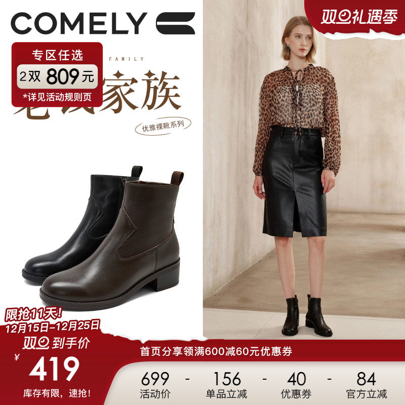fed真皮短靴冬季新款女靴粗跟马丁靴通勤时装靴女款S1104-YAB018