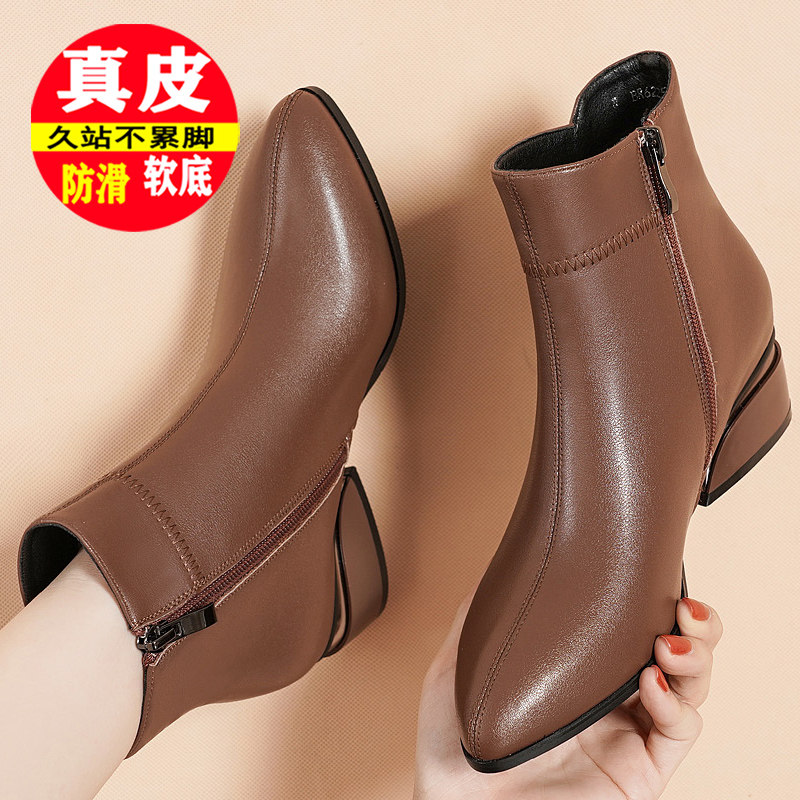 全牛皮真皮短靴粗跟软底鞋子冬季加绒加厚女靴子中年妈妈棉鞋皮鞋