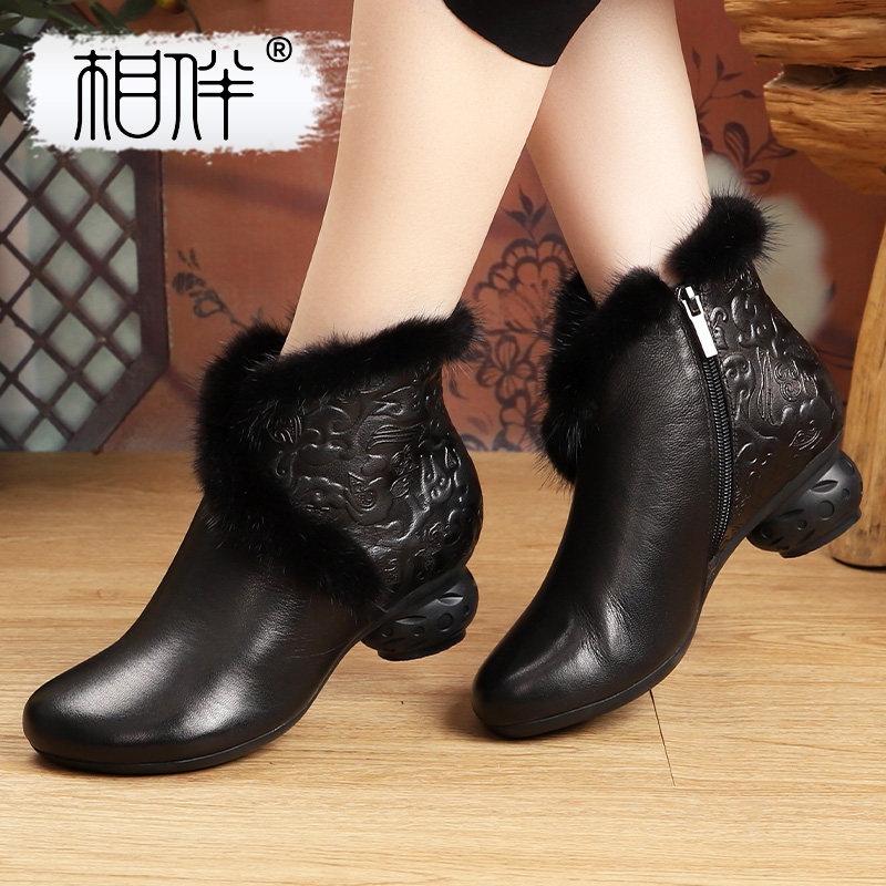 相伴真皮短靴女2025新款冬季加绒靴子貂毛口复古风粗跟民族风女靴