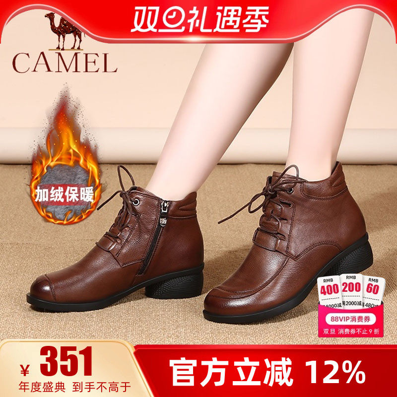 骆驼女鞋冬季新款棉鞋真皮防滑妈妈短靴粗跟时尚加绒保暖复古女靴