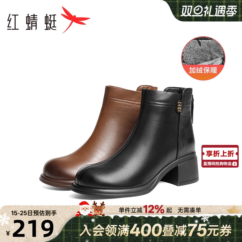 红蜻蜓女靴冬季新款粗跟高跟妈妈短靴加绒保暖靴子女真皮牛皮秋冬