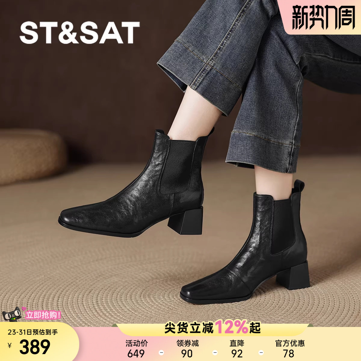 St&Sat星期六正品撤柜女靴黑色粗跟短靴冬季弹力袜靴时尚百搭短靴