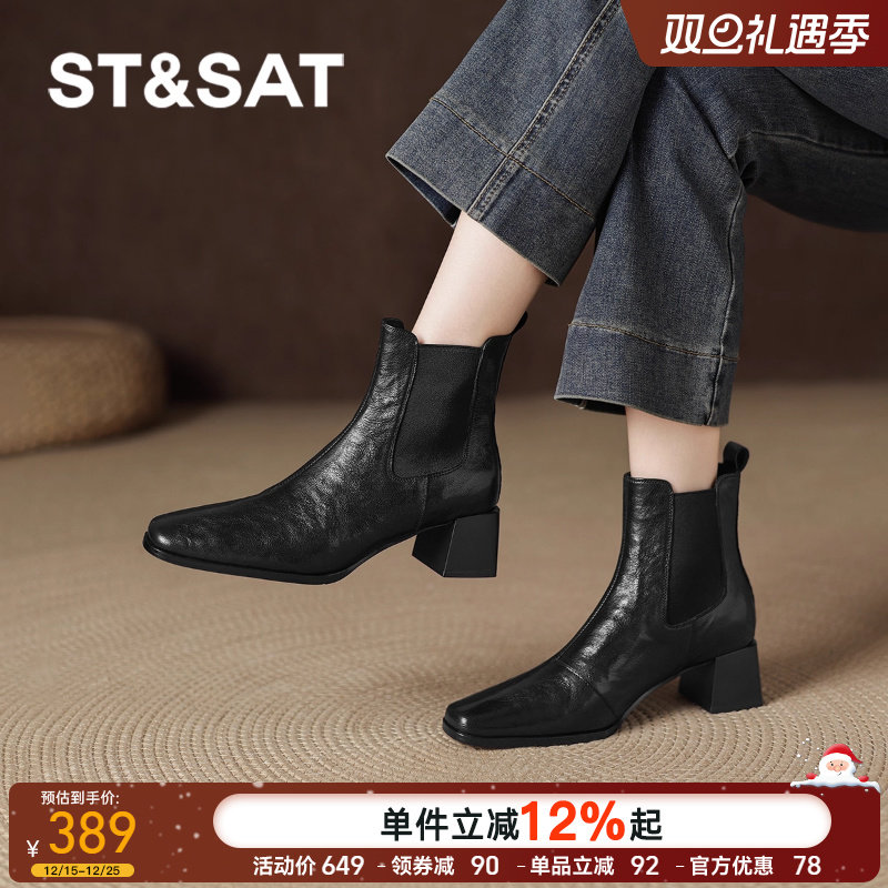 星期六加绒真皮短靴女2025新款秋冬季单靴高跟鞋粗跟瘦瘦靴女靴子