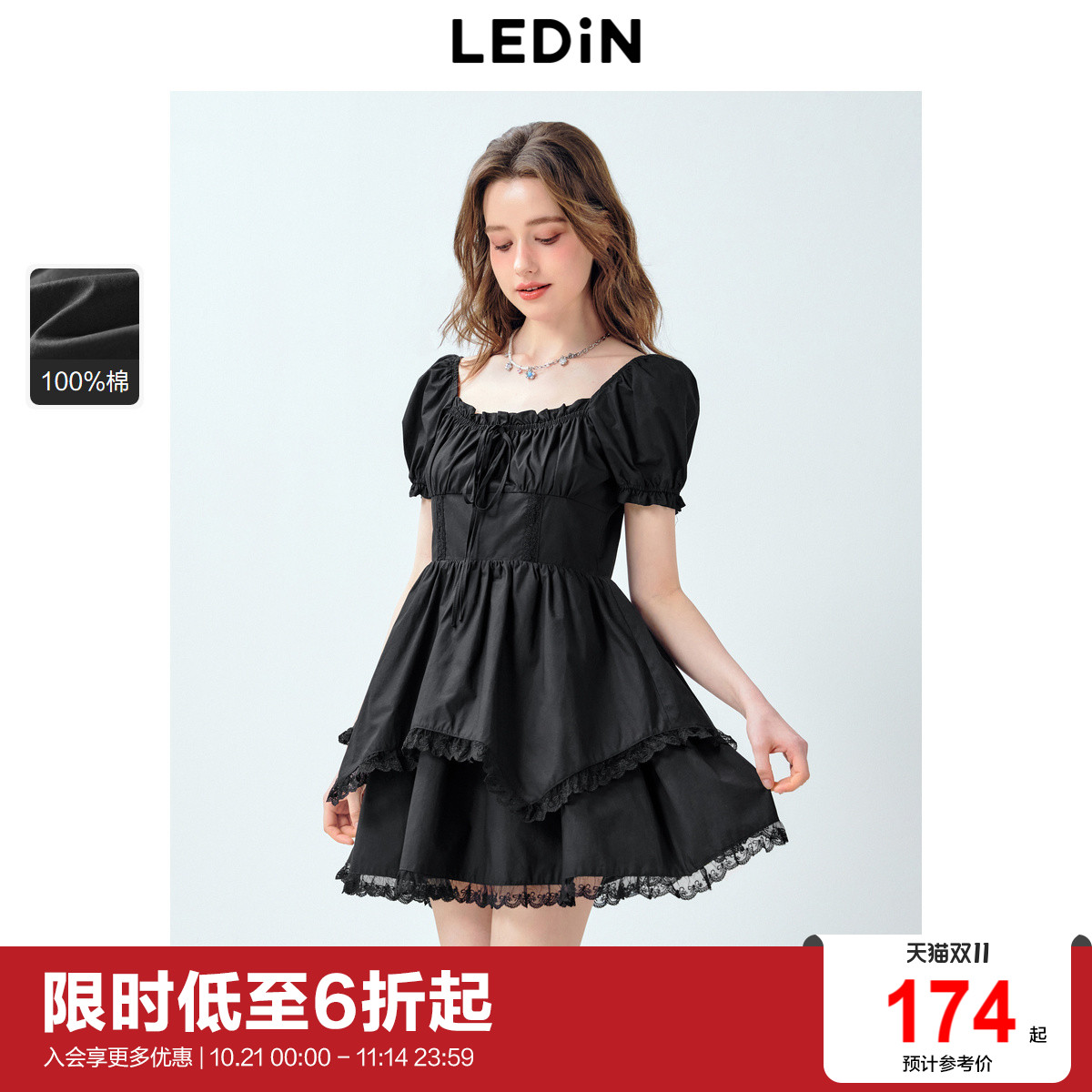 LIME莱茵年早春新款连衣裙圆领长袖高腰收腰小黑裙网纱泡泡袖