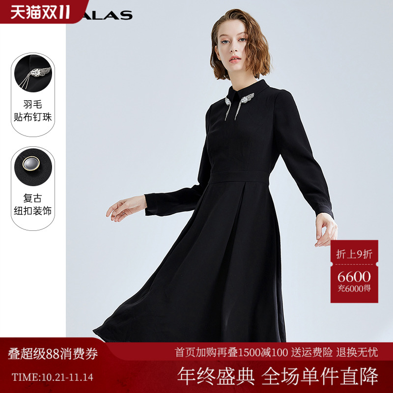 曼德诗高腰醋酸连衣裙2025秋装新款纯色衬衫裙时尚设计感小黑裙女