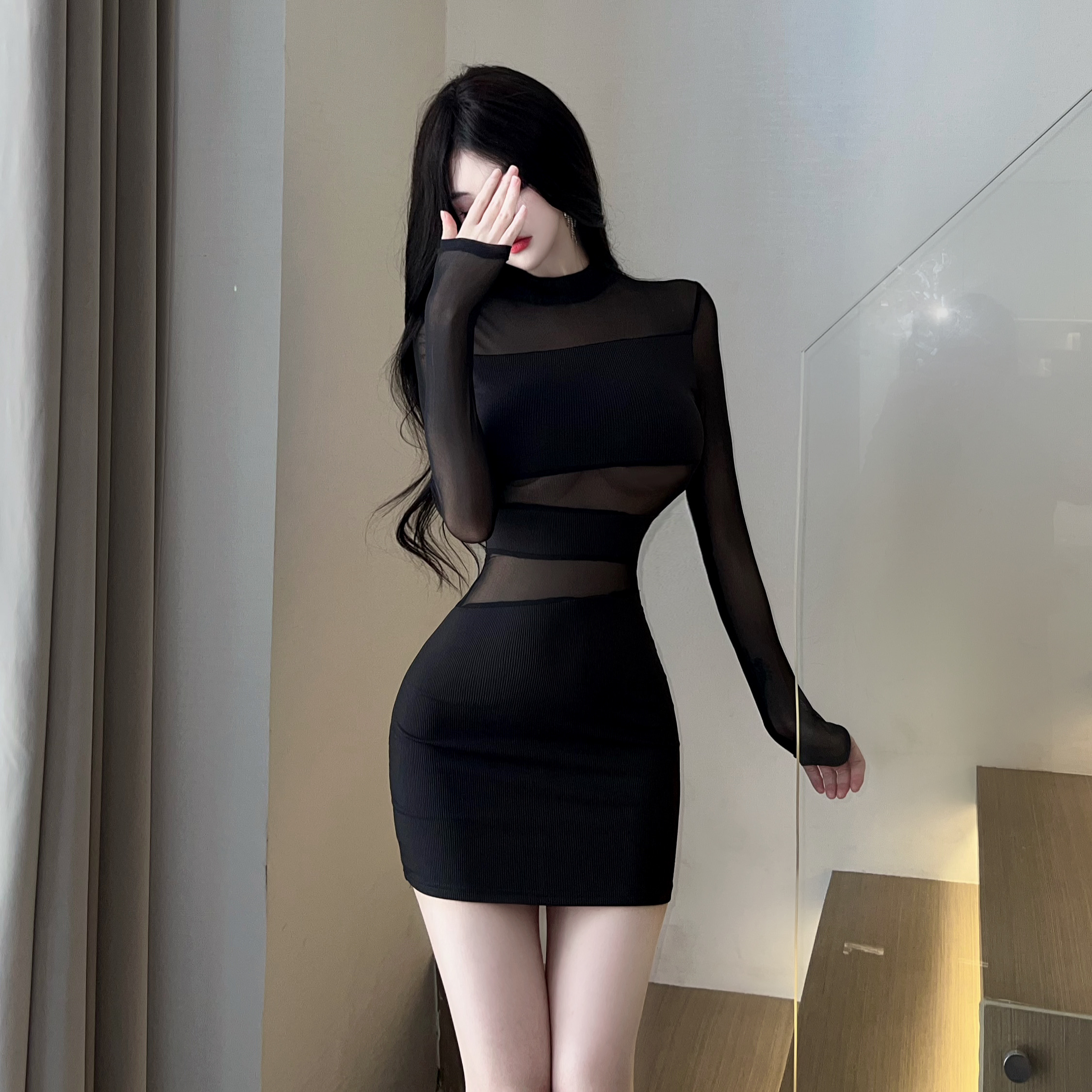 网红性感辣妹拼网纱长袖小黑裙街头洋气高腰修身包臀显瘦连衣裙女
