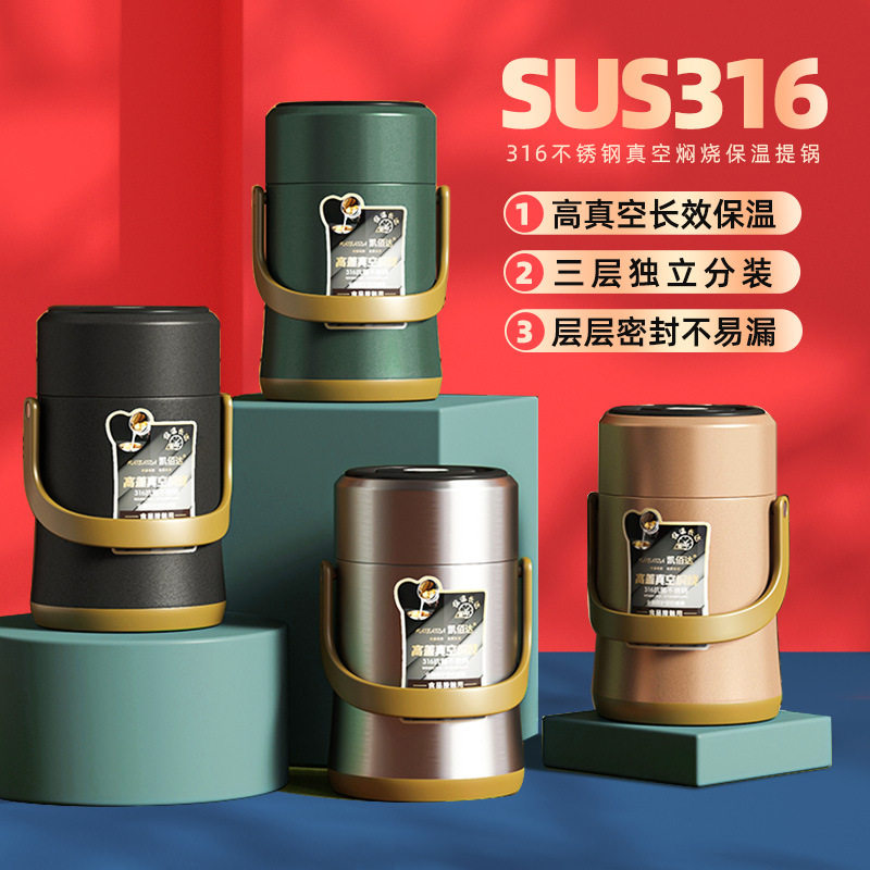 新款316钢保温提锅三层超长真空保温饭盒双人上班族防漏便携饭盒