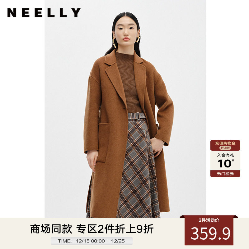 NEELLY纳俪商场同款一粒扣双面呢大衣女收腰系带气质长款毛呢外套