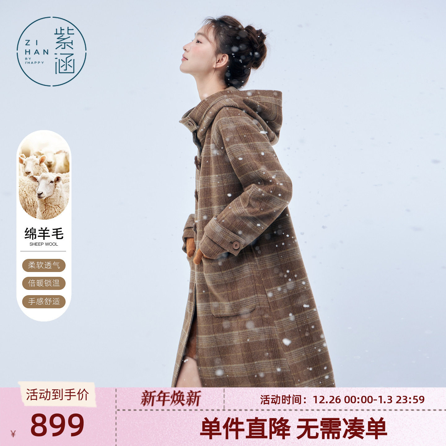 紫涵100%绵羊毛长款双面呢大衣女2025年冬季新款复古咖格连帽外套