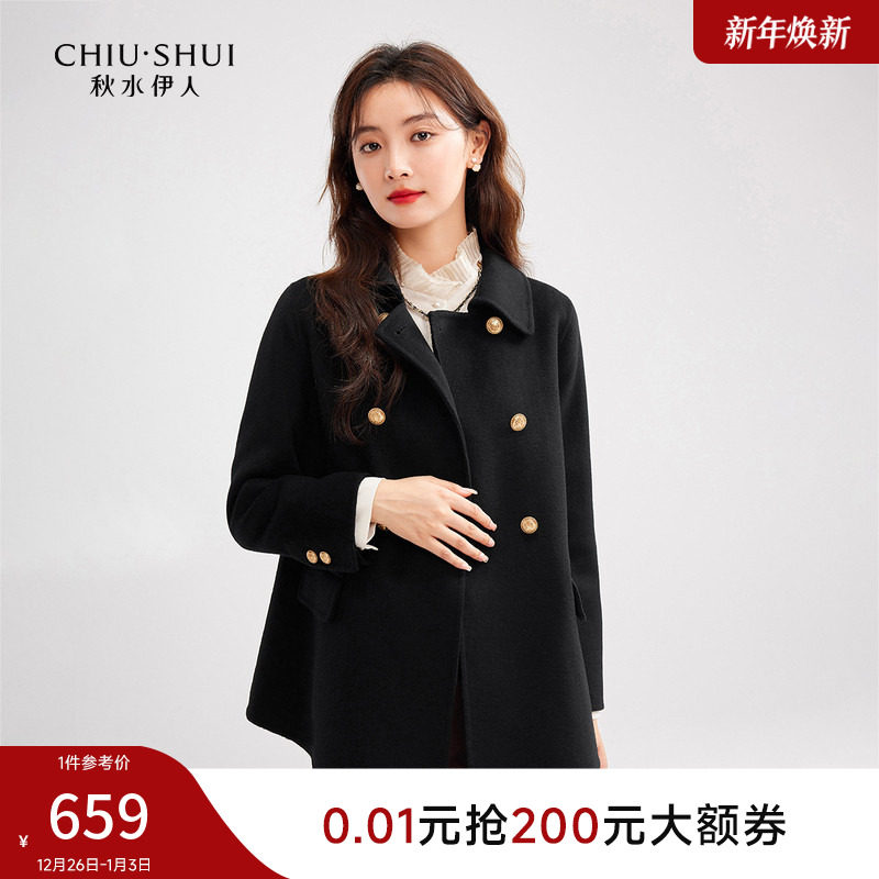 100%绵羊毛秋水伊人黑色双排扣毛呢大衣女2025冬新款双面呢外套