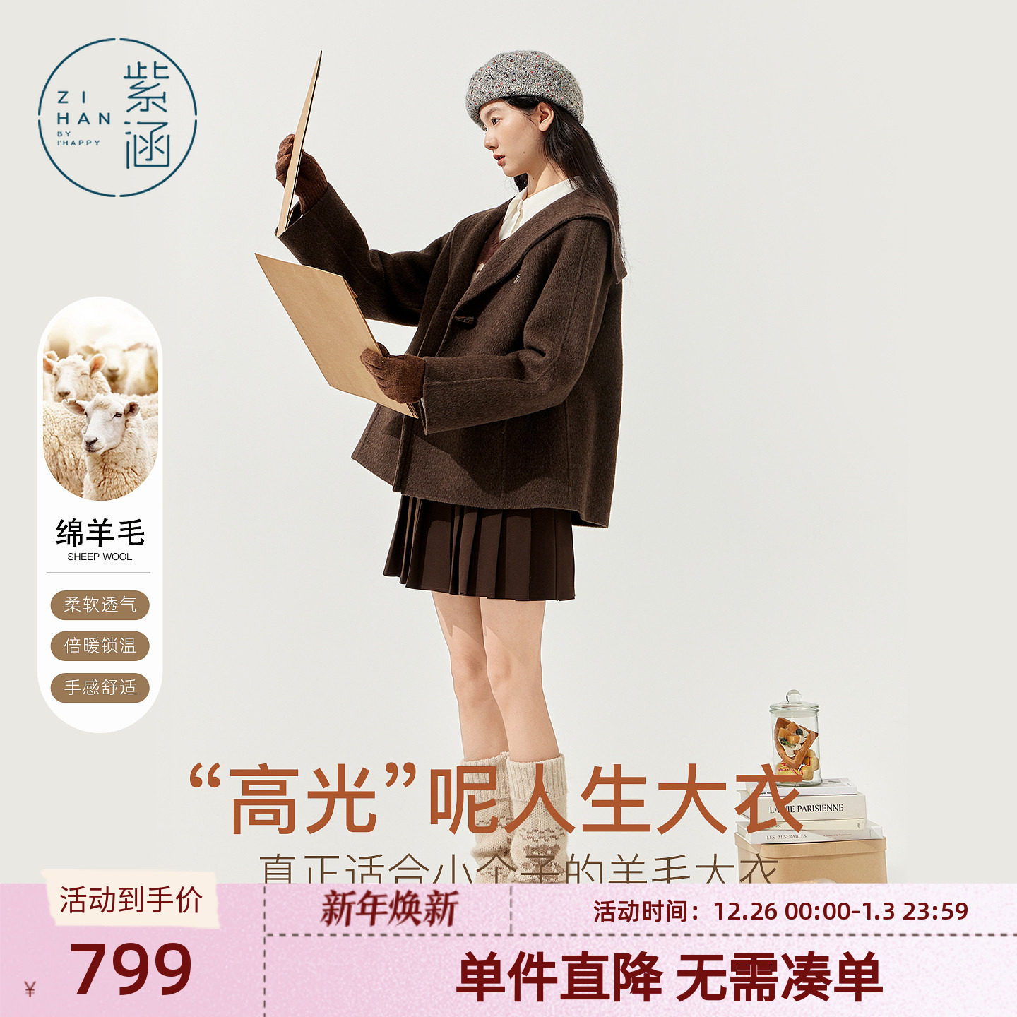 紫涵短款双面羊毛呢大衣女2025年冬季新款复古简约气质海军领外套