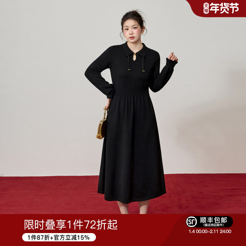 蓝语大码新中式黑色针织内搭连衣裙冬季a字收腰超好看打底毛衣裙