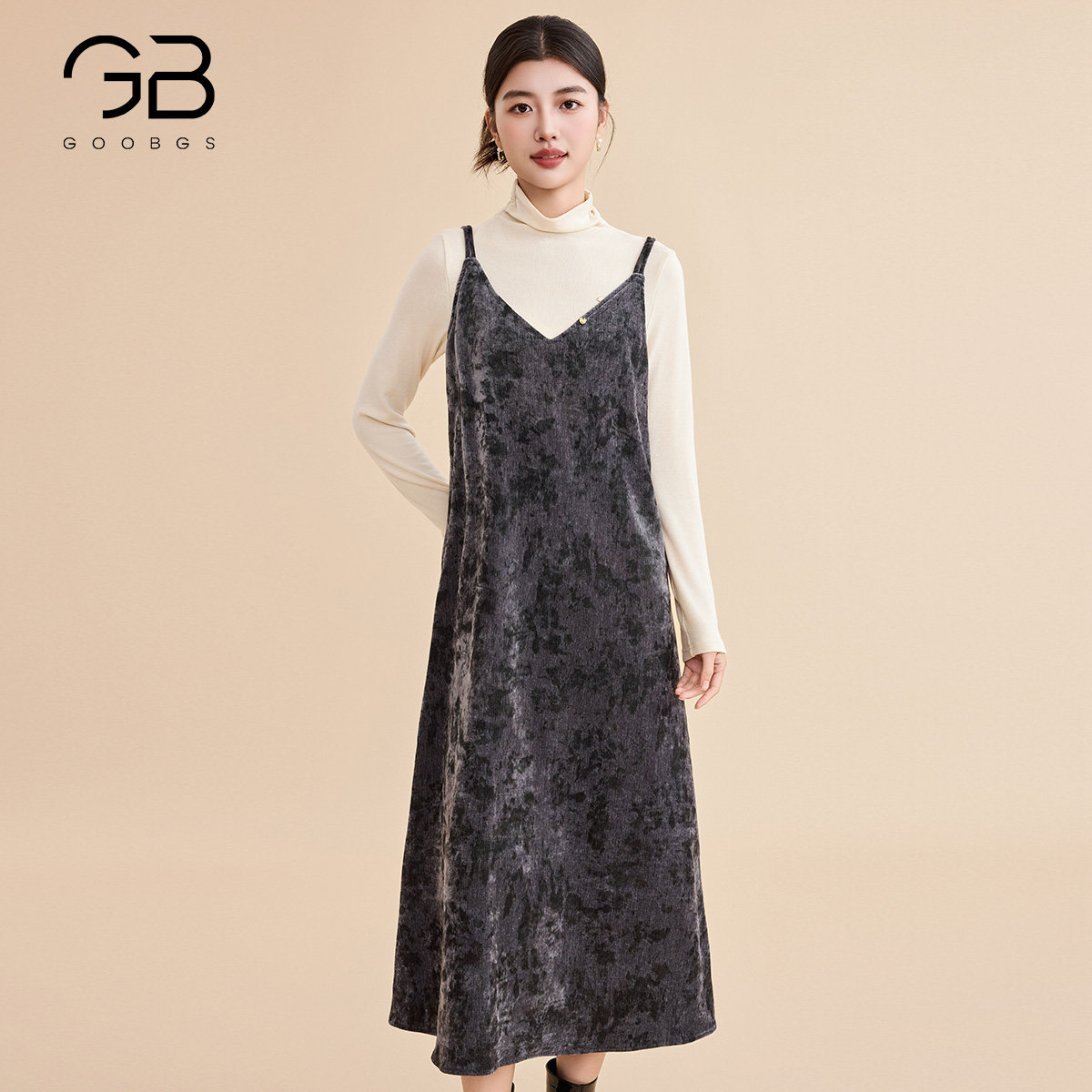 谷邦丝绒吊带连衣裙女2025冬季新款印花a字裙内搭打底中长款裙子