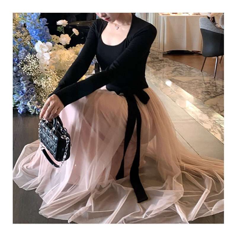 法式气质长裙修身方领网纱拼接A字针织连衣裙女25冬季打底假两件