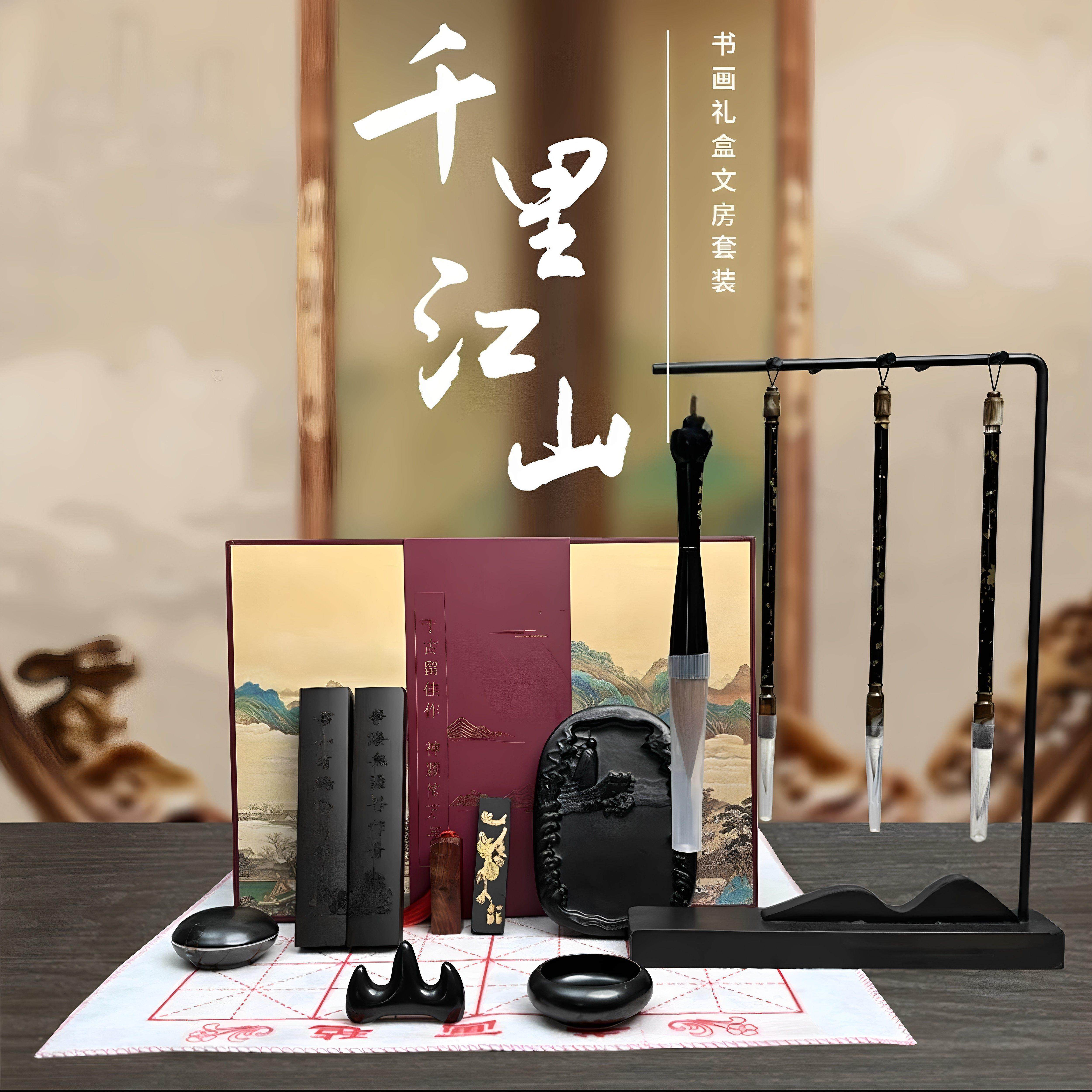 千里江山图古风套装学生随手礼物文房四宝套件毛笔墨纸砚礼盒套组