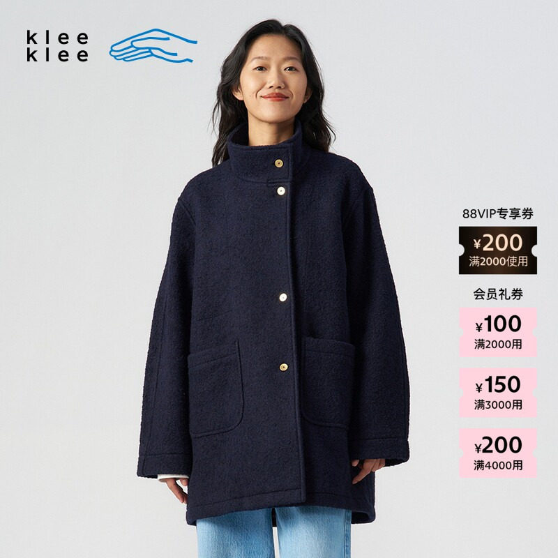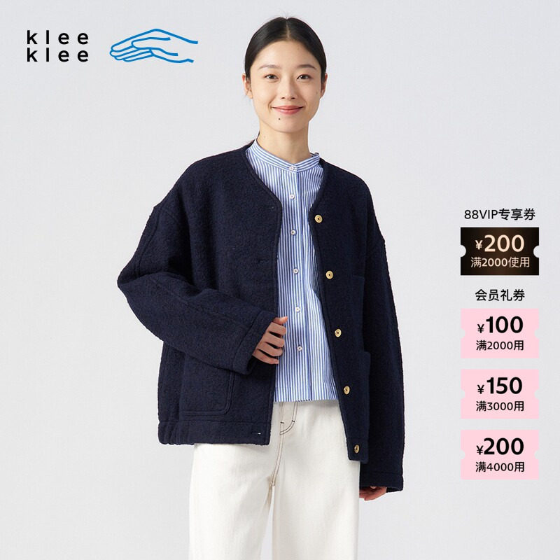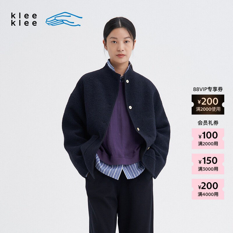 素然 klee klee 25冬女士经典粗花呢蓝布宽松立领短大衣