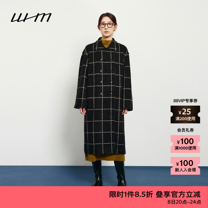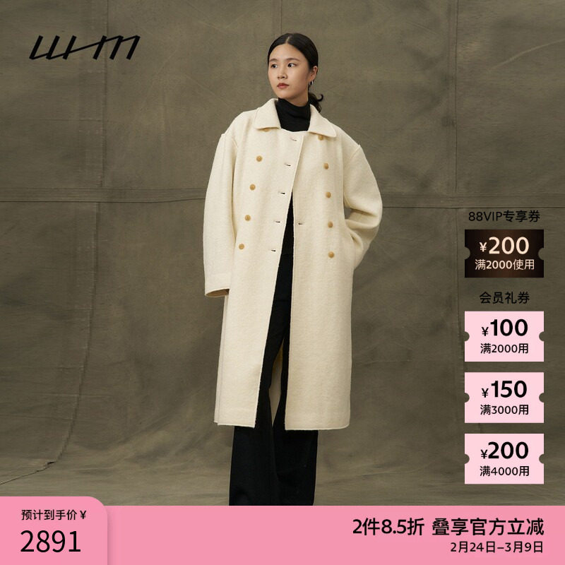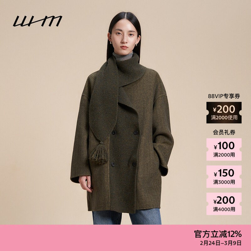 素然WHM 秋季女士复古气质慵懒羊毛柔软纹理针织呢双排扣长大衣