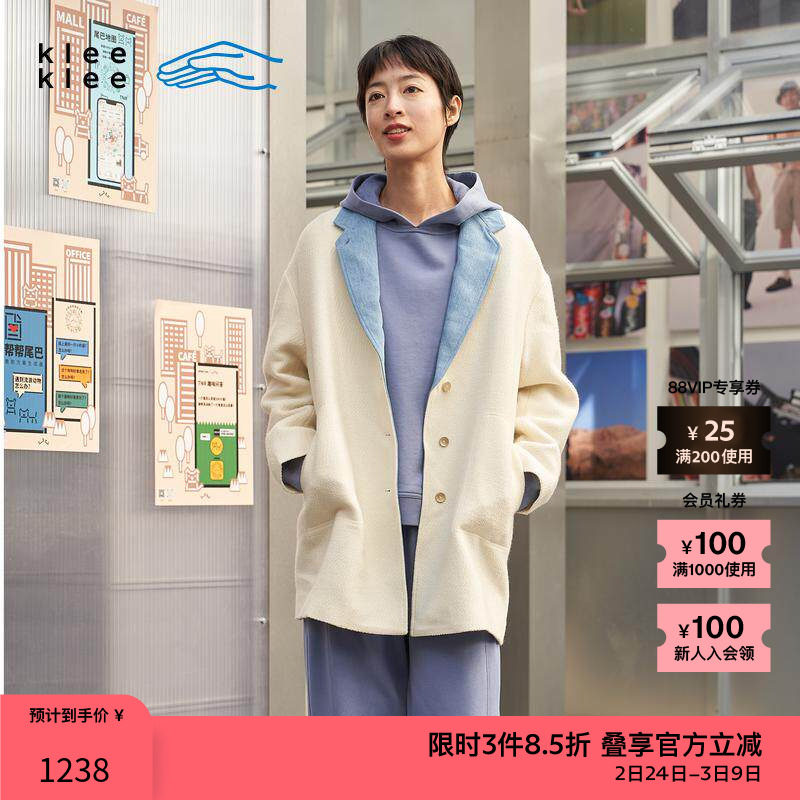 素然klee klee 秋冬女士休闲宽松羊毛圈圈呢蓝布短大衣