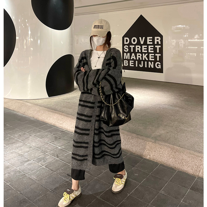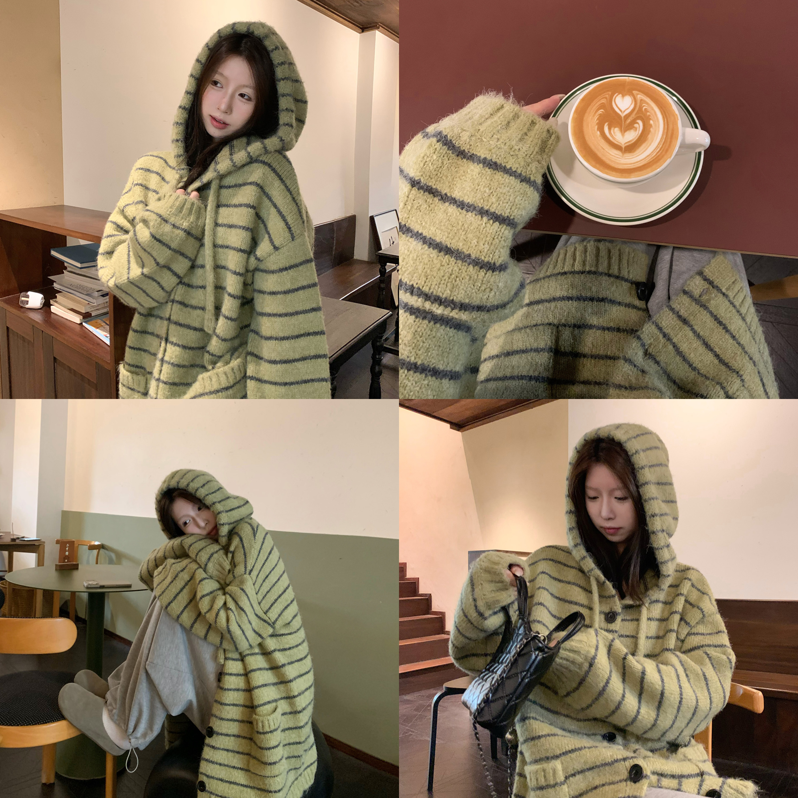 减龄显白米色慵懒风条纹连帽毛衣开衫女秋冬韩系中长款厚实针织衫