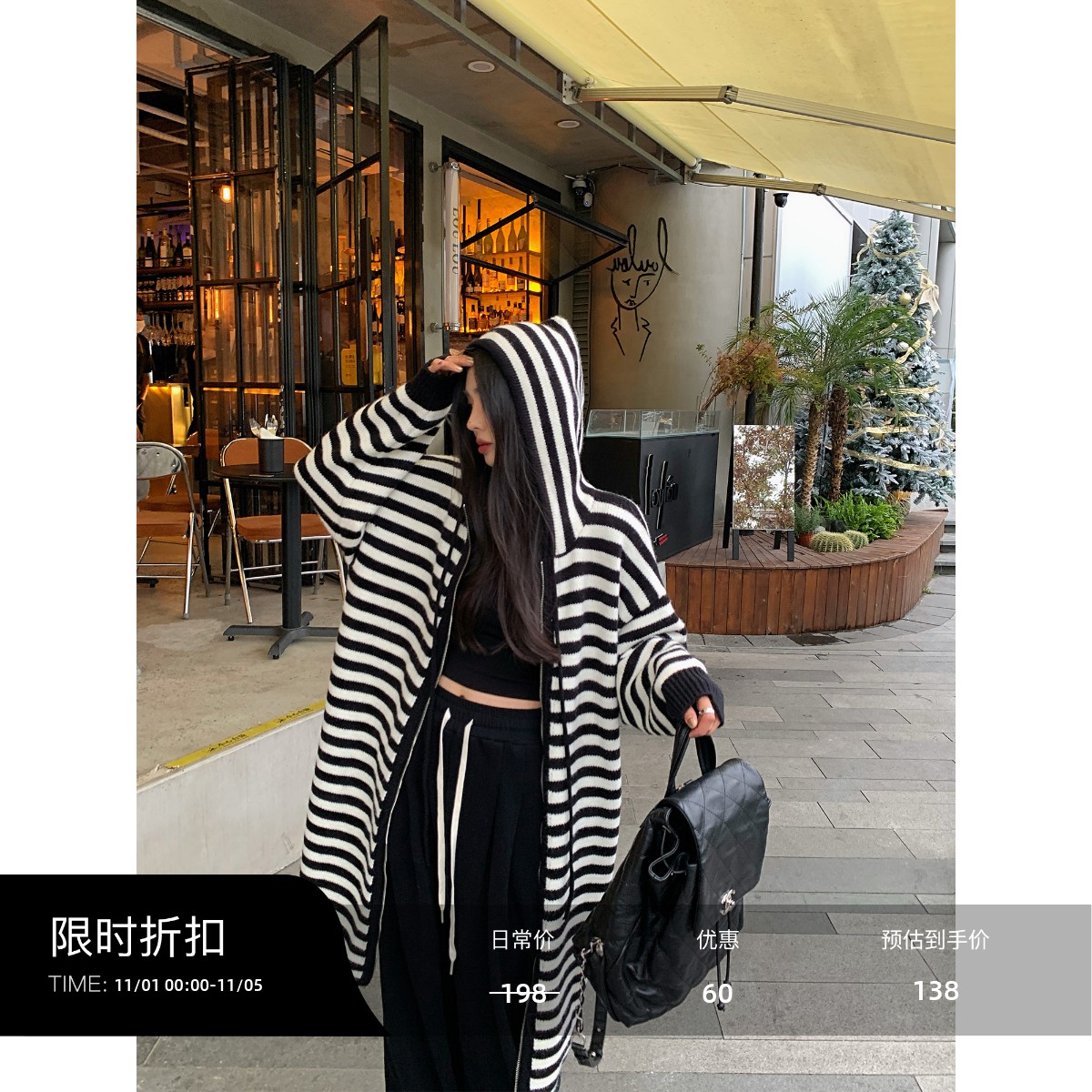辰米范 黑白条纹中长款连帽针织开衫女秋冬2025新款宽松毛衣外套