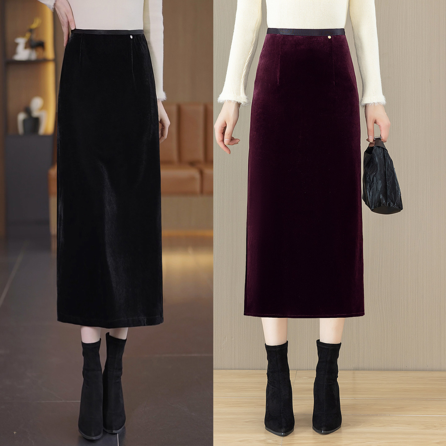 秋冬加绒金丝绒半身裙女黑色中长款一步裙包臀新款百搭高腰开叉裙