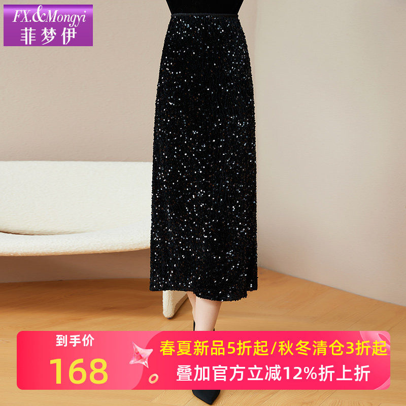 菲梦伊黑色金丝绒亮片半身裙女中长款春装高腰显瘦气质A字礼服裙