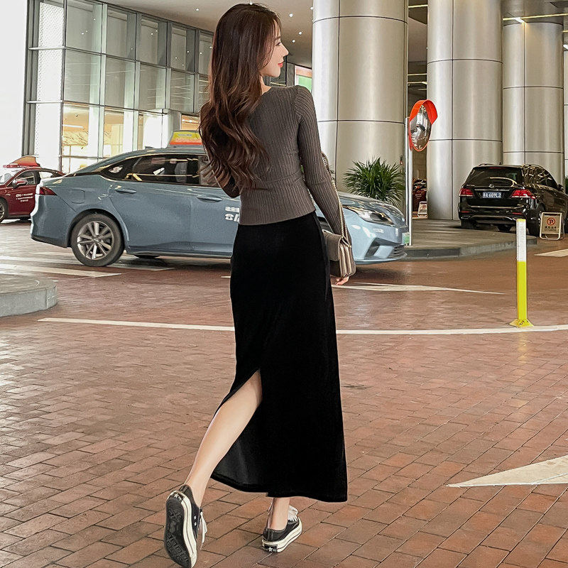 黑色金丝绒直筒半身裙女春秋新款高腰显瘦包臀裙中长款开叉一步裙